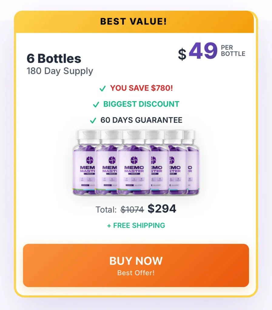 If you want to think faster, remember better, and unlock long-term mental clarity, purchase only from the official MemoMaster website. There, you’ll receive the authentic, clinically tested formula—backed by our 60-day, no-questions-asked money-back guarantee. That means you can try MemoMaster completely risk-free, and if you’re not thrilled with your results, you’ll get every penny back.